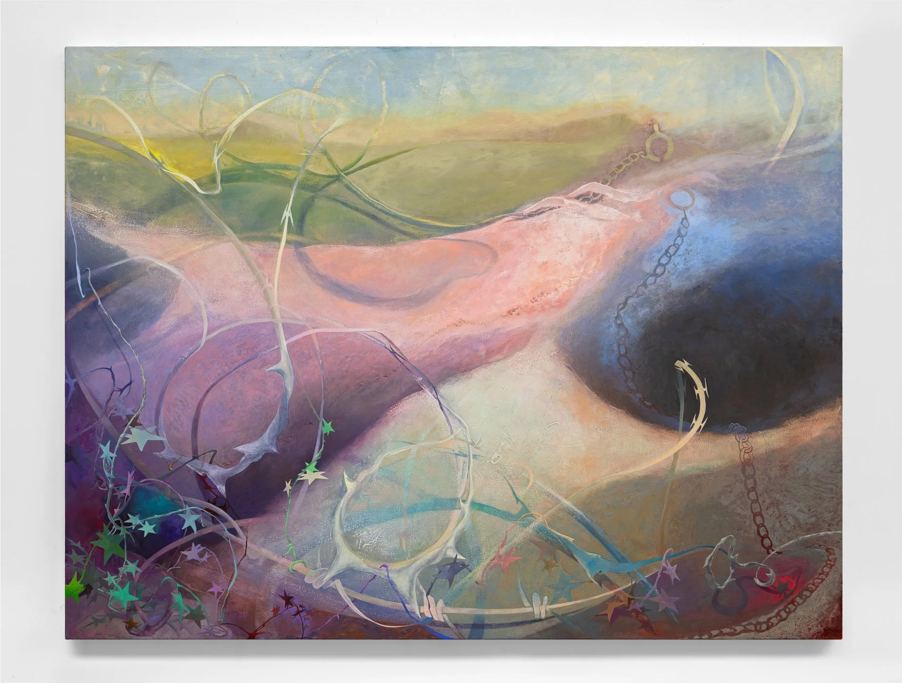 Overlook, oil with thread, moon necklace, and hair on canvas, 50 x 66 inches, 2025